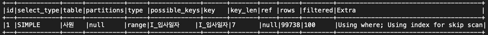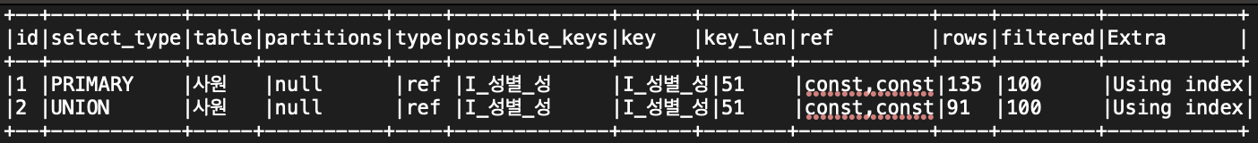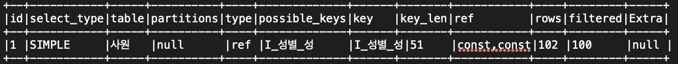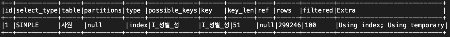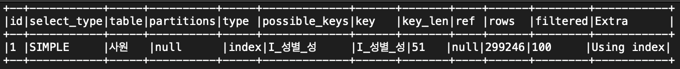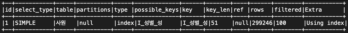 - key = I_성별_성 인덱스 -> 인덱스 풀 스캔 방식 수행