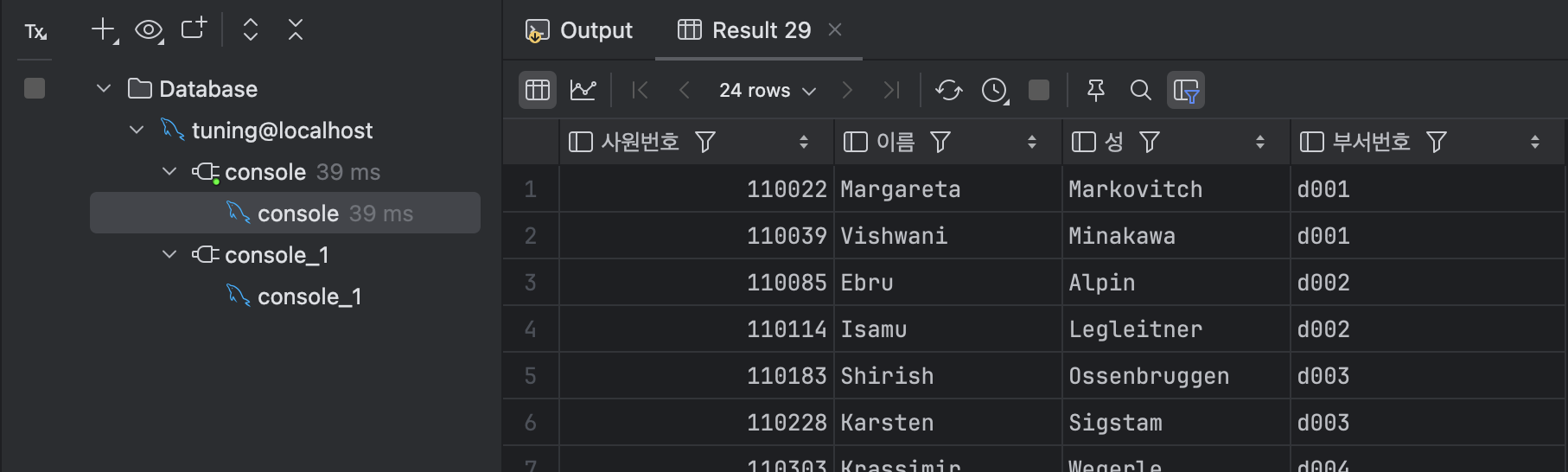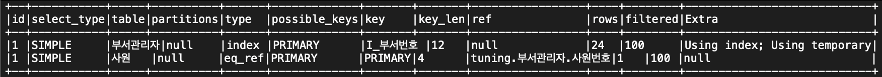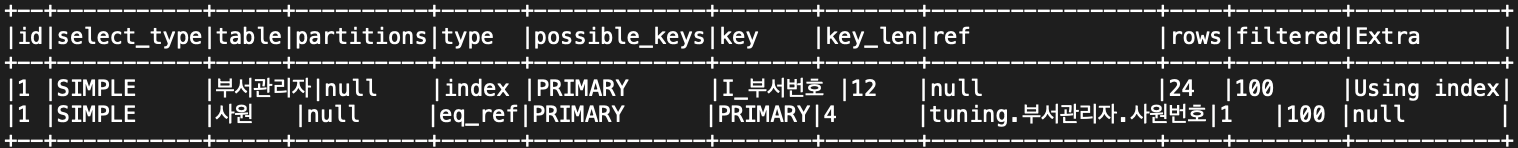 - type = eq_ref & ref = tuning.부서관리자.사원번호