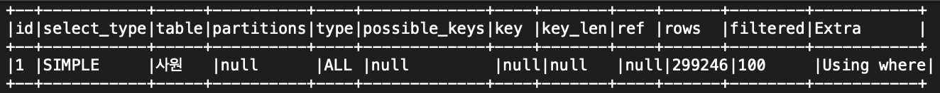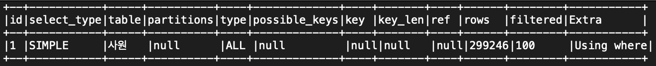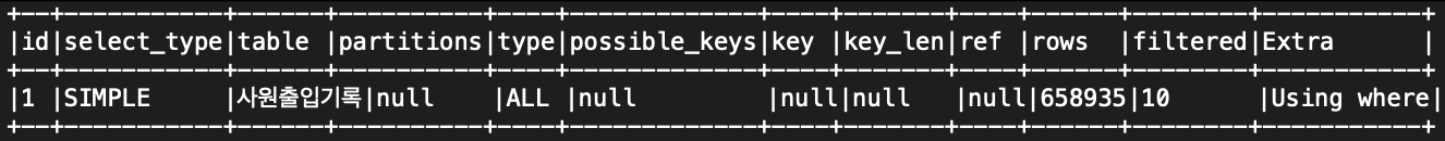- type = ALL 이므로, 테이블 풀 스캔 방식을 사용하여 인덱스를 사용하지 않음 -> 필요 범위 접근이 아니라 비효율적일 수 있음