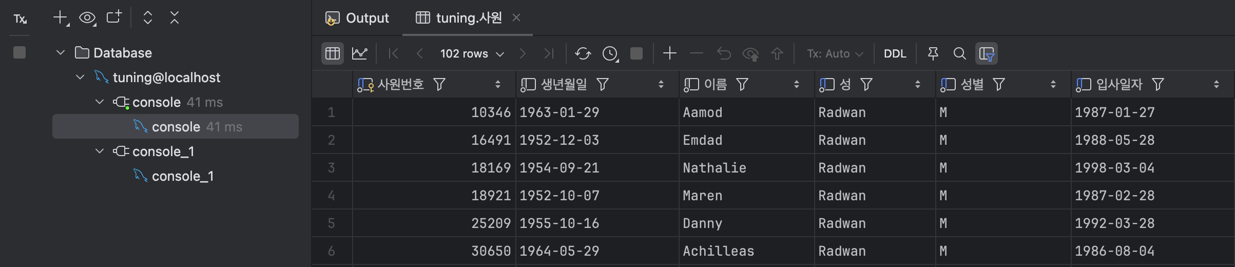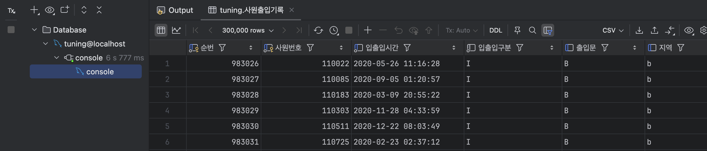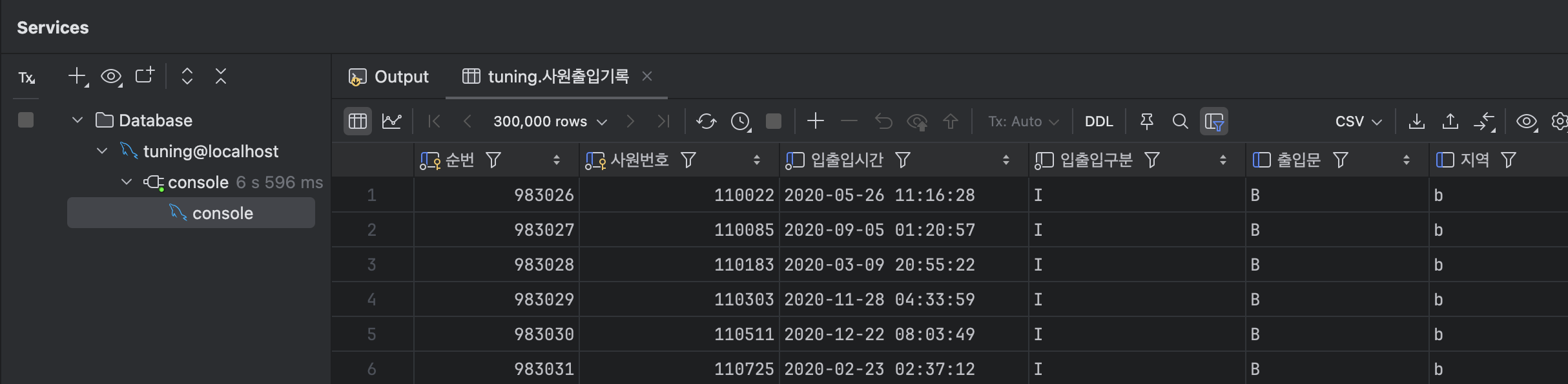- 전체 데이터는 300,024 건이고, 그중 102건의 데이터를 조회하는 것임을 알 수 있음
