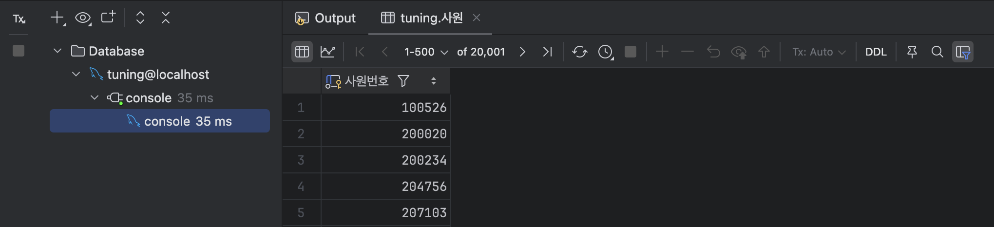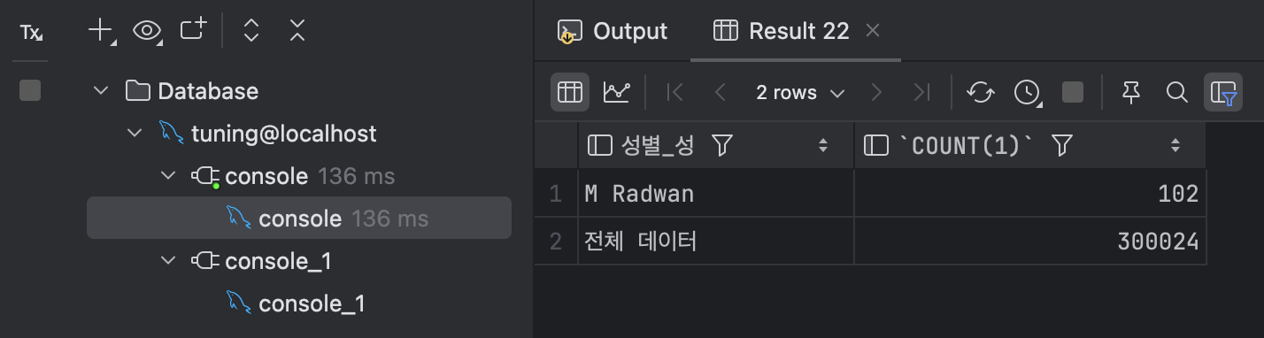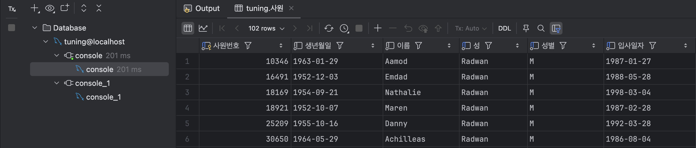 - 전체 데이터는 300,024 건이고, 그중 102건의 데이터를 조회하는 것임을 알 수 있음