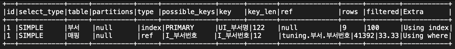 EXPLAIN SELECT STRAIGHT_JOIN 매핑.사원번호, 부서.부서번호