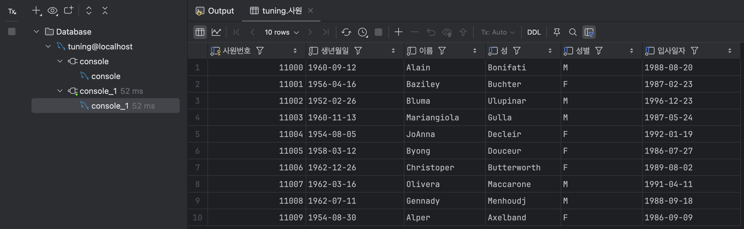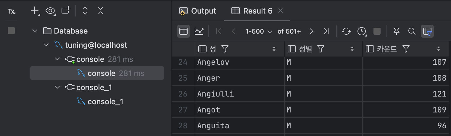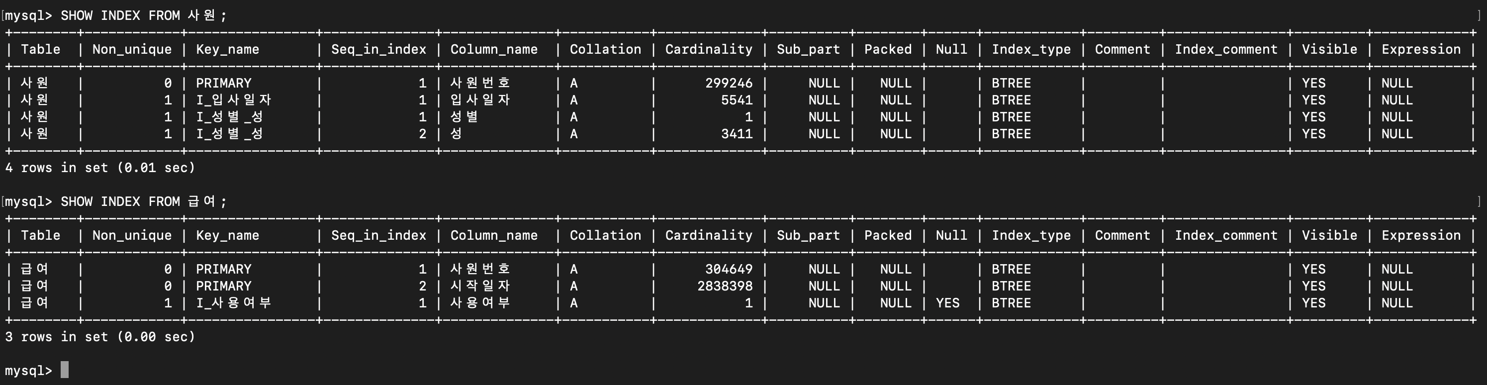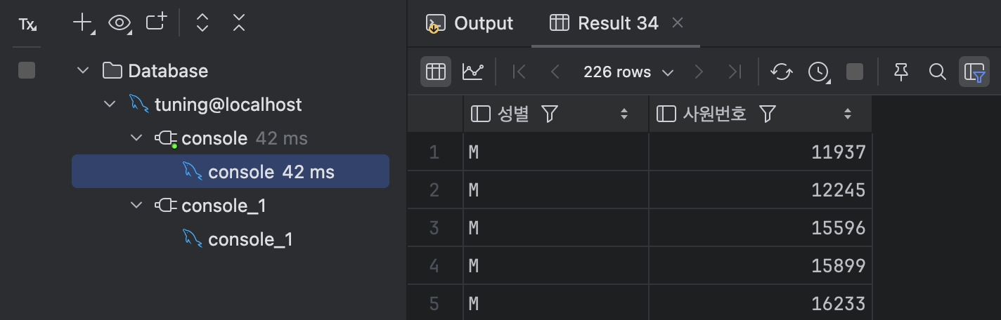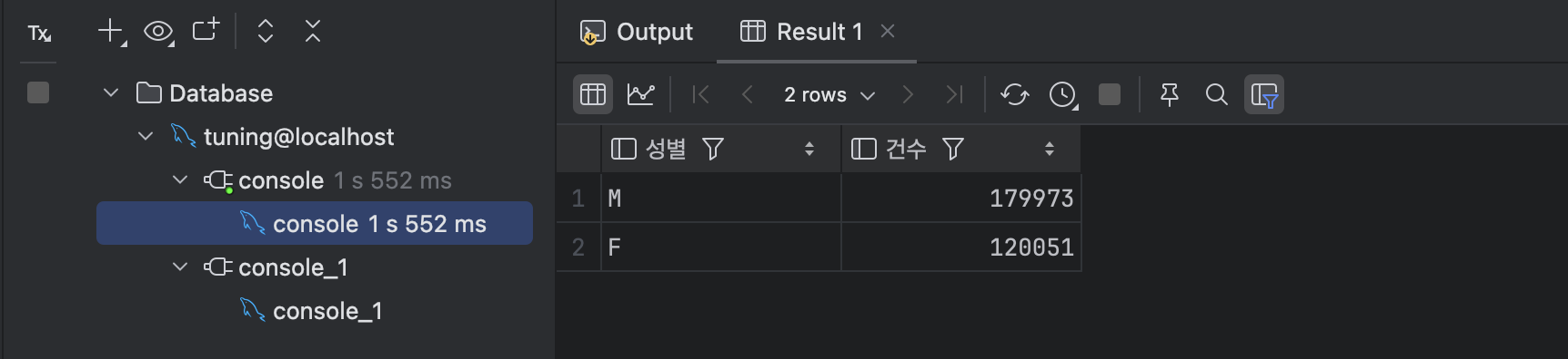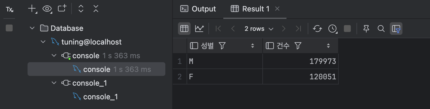 - SQL 문에서 WHERE 절의 경우, 성별과 성 컬럼이 동등(=) 조건으로 작성되어 있으므로, I_성별_성 index로 빠른 조회 가능