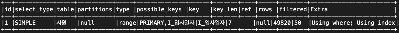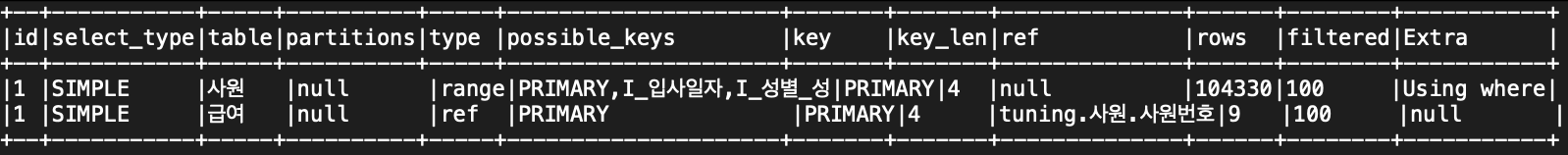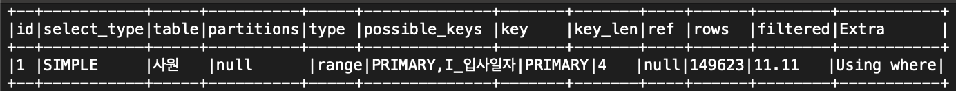- key = PRIMARY & type = range -> 기본 키를 활용해서 범위 스캔 수행
