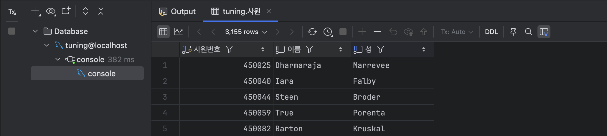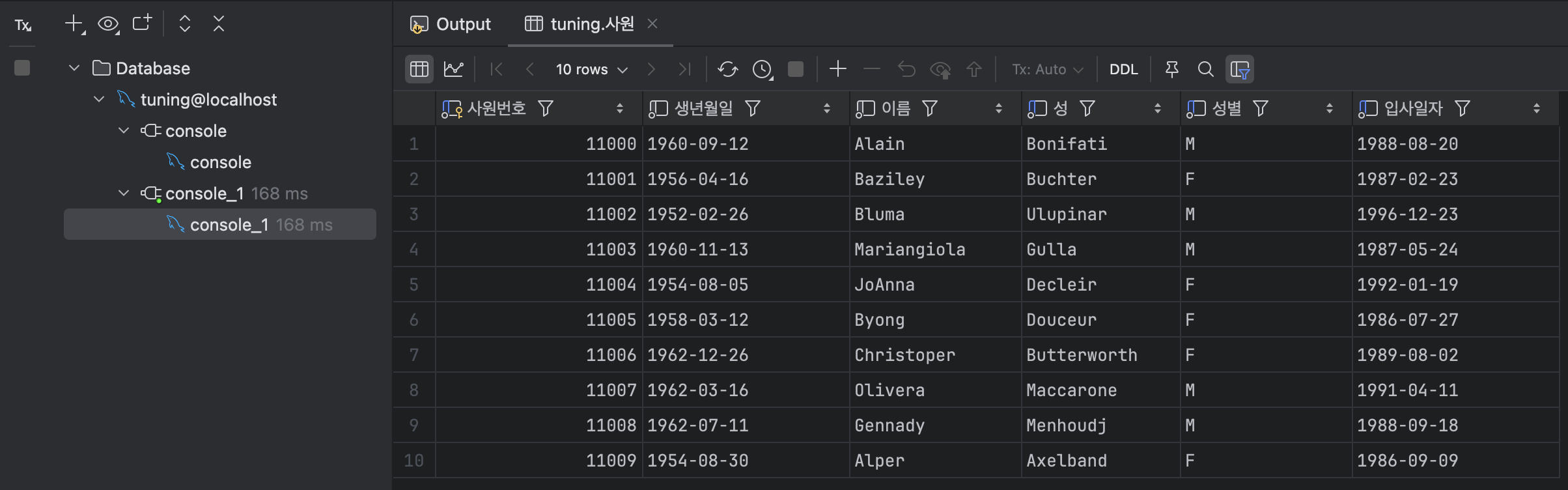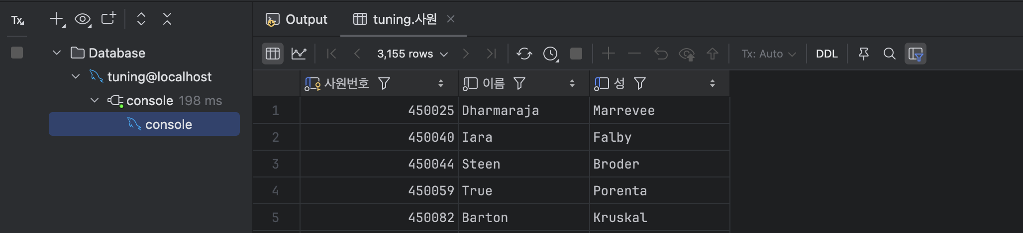 - 튜닝 전에는 30만 건의 데이터에 접근했다면, 튜닝 후에는 102 건의 데이터에만 접근