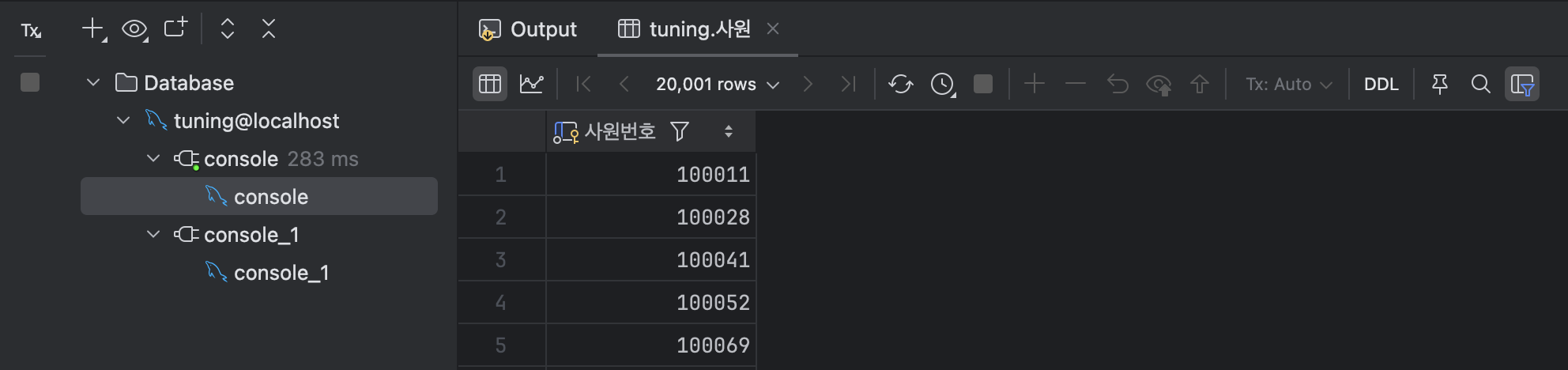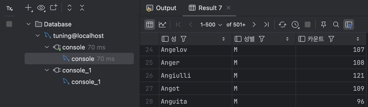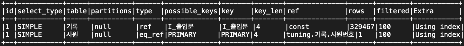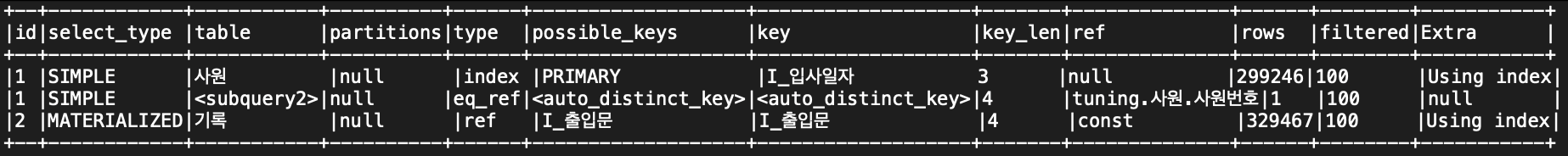 - 튜닝 수행 전과 다르게 임시 테이블 없이 인덱스만 사용하여 데이터를 추출하고 있음