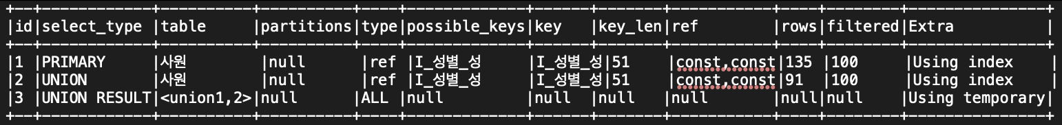 - Extra = Using index; Using temporary -> 인덱스 사용, 임시 테이블 생성