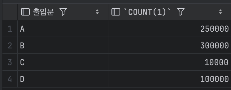 - 총 66만 건의 데이터를 가진 사원출입기록 테이블에서 출입문 B는 전체 데이터의 50%인 30만 건을 차지함