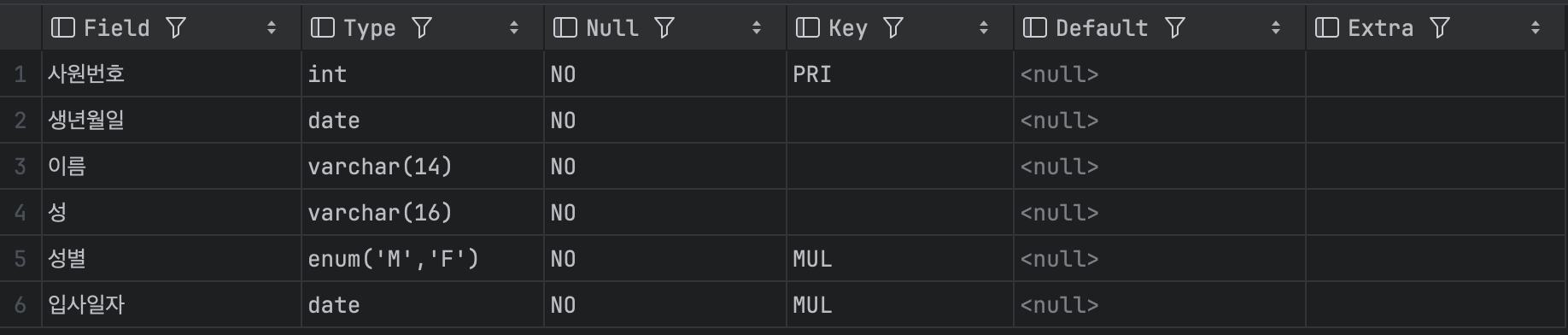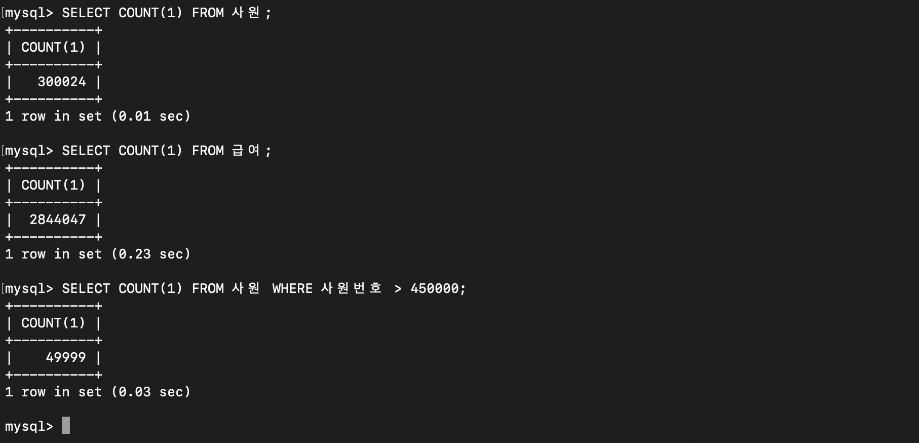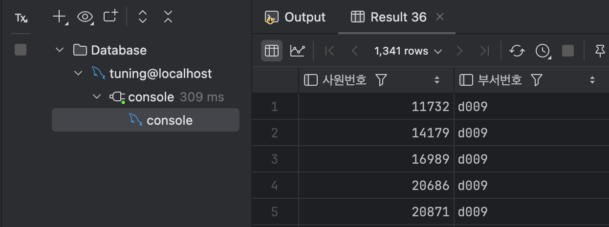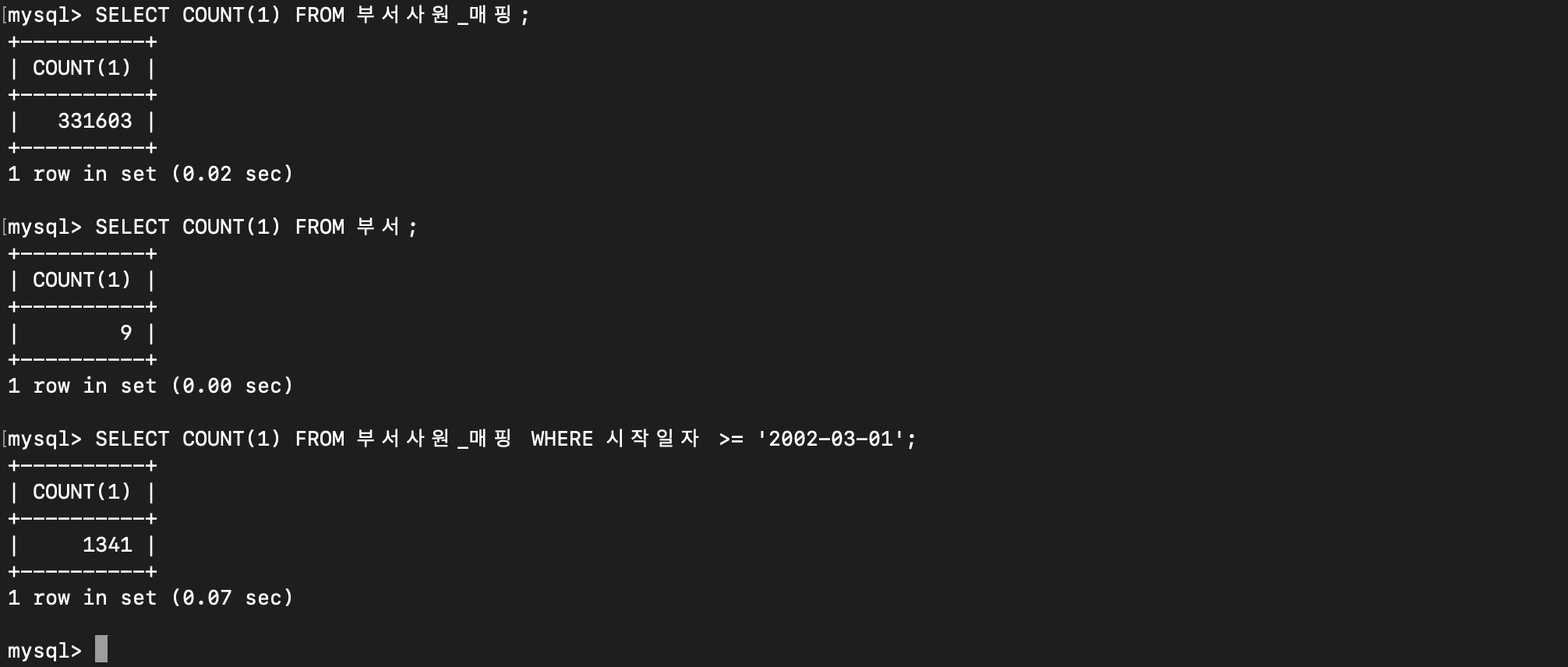 - 위와 같이 부서 테이블에는 9건의 데이터가 있고, 부서사원_매핑 테이블에는 약 33만 건의 데이터가 존재함