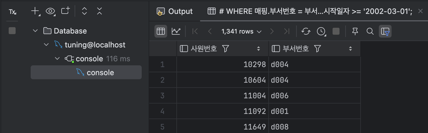 WHERE 매핑.부서번호 = 부서.부서번호 AND 매핑.시작일자 >= '2002-03-01';