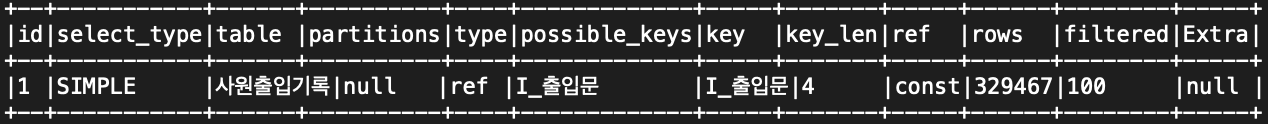 - ref = const -> WHERE 절에서 출입문 = 'A'인 상수와 비교하므로