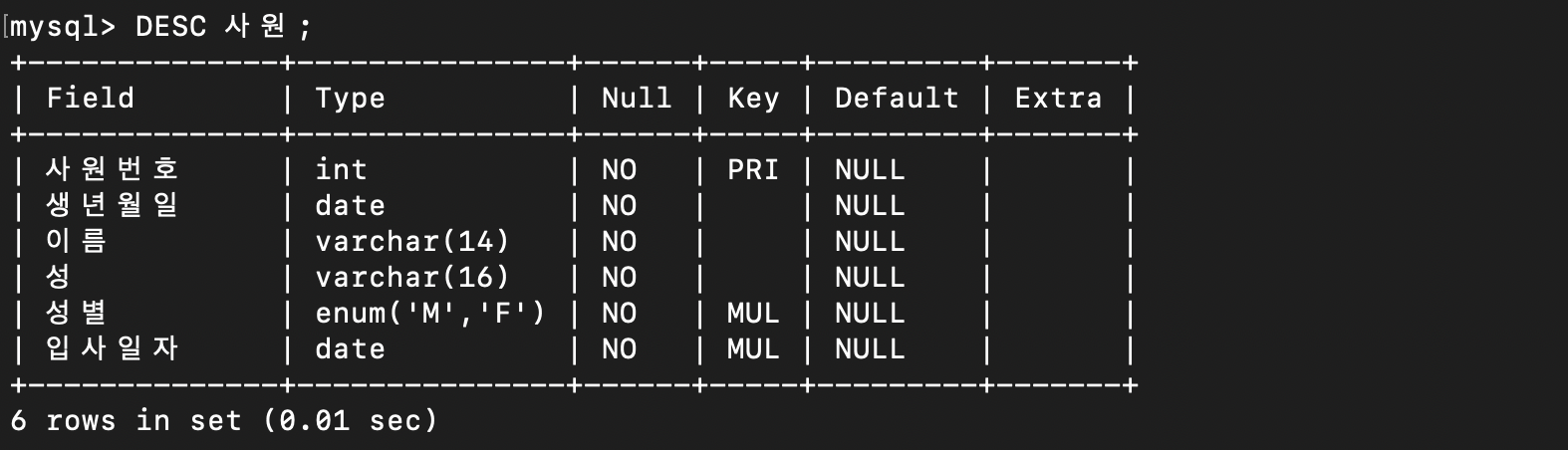 - 사원 테이블의 성별에는 NOT NULL 조건으로 인해 NULL 값이 존재하지 않고 M/F 만 저장되고 있음