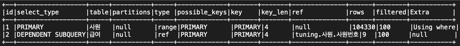 - select_type = DEPENDENT SUBQUERY -> 사원 테이블로부터 조건을 전달받아 수행해야 하는 의존성을 가진 서브쿼리
