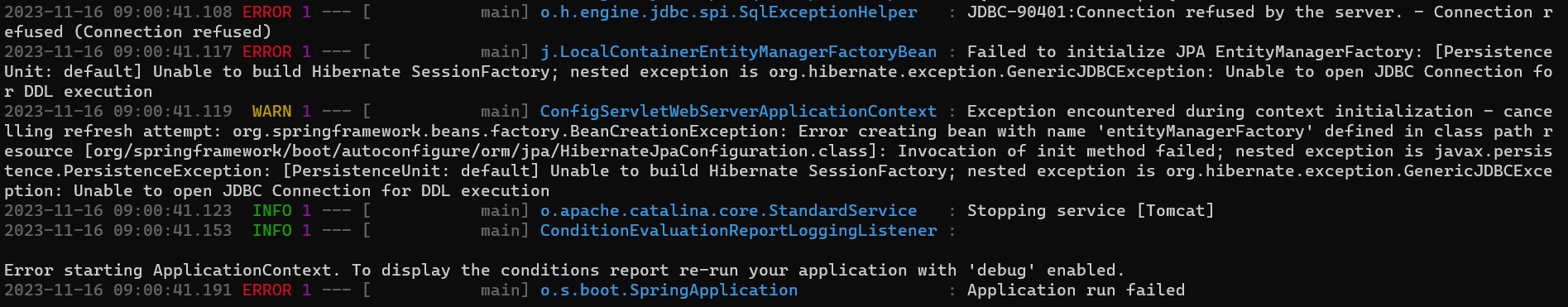 이 오류를 해결하기 위해서 상당히 많은 시간이 소요되었다. 분명 로컬 환경에서 Spring JPA와 Tibero6를 연결할 때 문제없이 잘 되었는데 배포할 때 다음과 같은 오류가 발생하니 너무 당혹스러웠다. 여러 블로그들을 찾아보니 DB 접속 정보를 잘못 작성했거나, DB가 기동 중이지 않을 경우 등 나와는 해당되지 않는 이유들이어서 해결하는 데 더 애를 먹었던 것 같다.