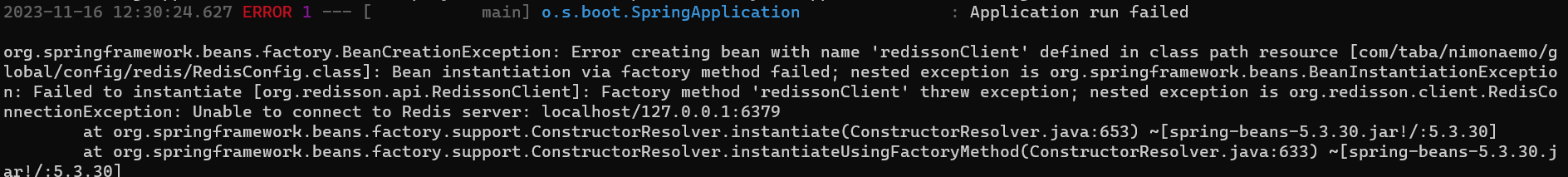 org.springframework.beans.factory.BeanCreationException: Error creating bean with name 'redissonClient' defined in class path resource [com/taba/nimonaemo/global/config/redis/RedisConfig.class]: Bean instantiation via factory method failed; nested exception is org.springframework.beans.BeanInstantiationException: Failed to instantiate [org.redisson.api.RedissonClient]: Factory method 'redissonClient' threw exception; nested exception is org.redisson.client.RedisConnectionException: Unable to connect to Redis server: localhost/127.0.0.1:6379