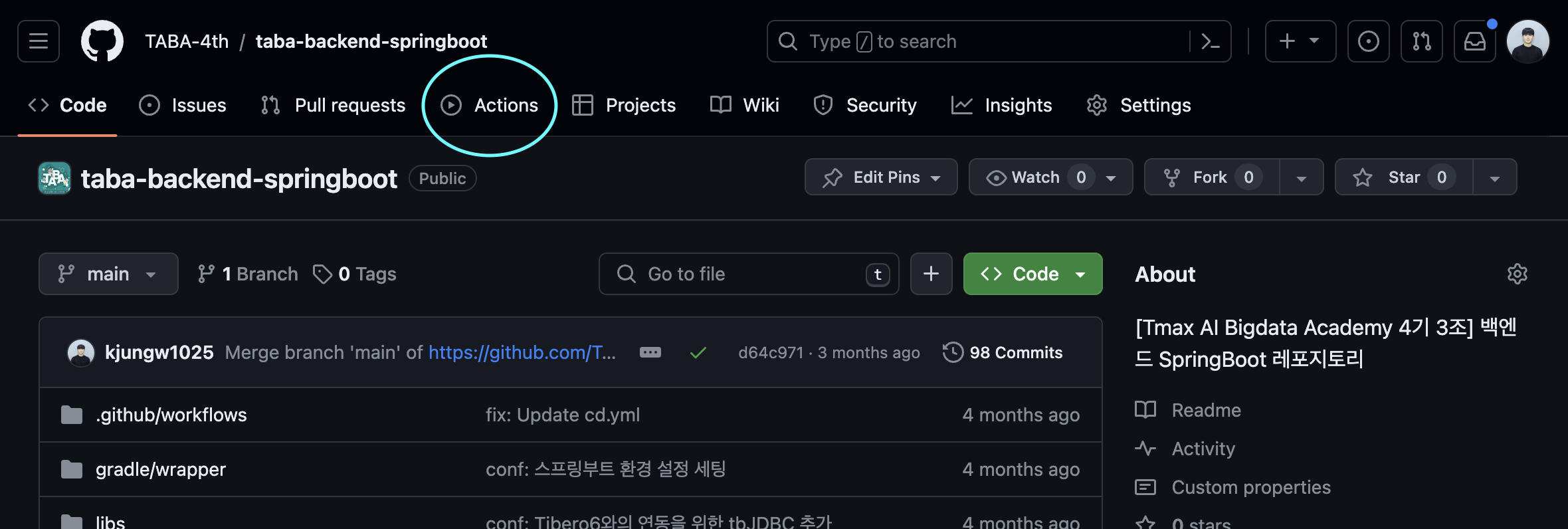 우선, Github Action을 사용하고자 하는 깃허브 레포지토리에 들어간다.