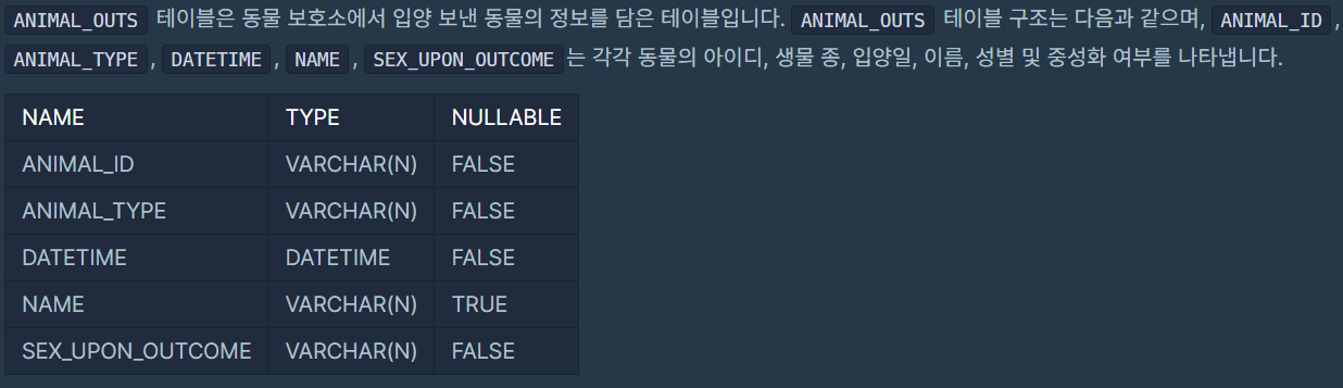 🆀 문제 ANIMAL_OUTS 테이블은 동물 보호소에서 입양 보낸 동물의 정보를 담은 테이블입니다. ANIMAL_OUTS 테이블 구조는 다음과 같으며, ANIMAL_ID, ANIMAL_TYPE, DATETIME, NAME, SEX_UPON_OUTCOME는 각각 동물의 아