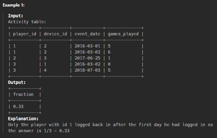 Write a solution to report the fraction of players that logged in again on the day after the day they first logged in, rounded to 2 decimal places.