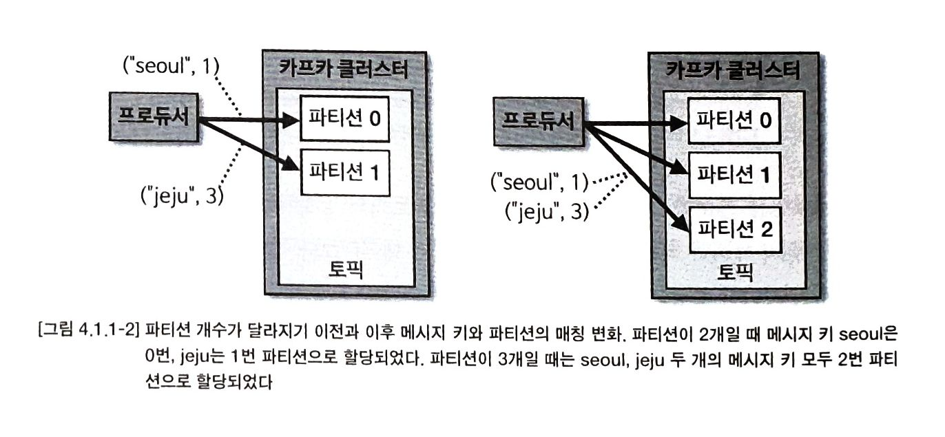 만약 위 그림과 같이 파티션 개수가 달라지면, 이때 매칭된 파티션과 메시지 키의 매칭이 깨지고