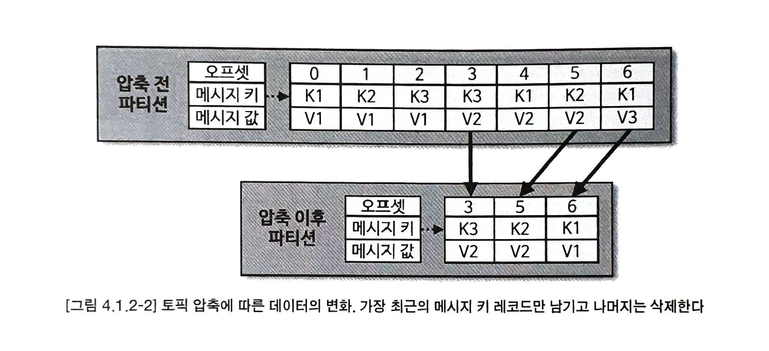 여기서 압축이란, 메시지 키별로 해당 메시지 키의 레코드 중 오래된 데이터를 삭제하는 정책을 뜻한다.