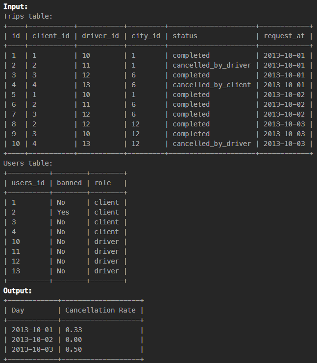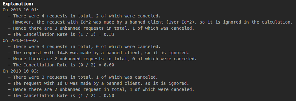 The cancellation rate is computed by dividing the number of canceled (by client or driver) requests with unbanned users by the total number of requests with unbanned users on that day.