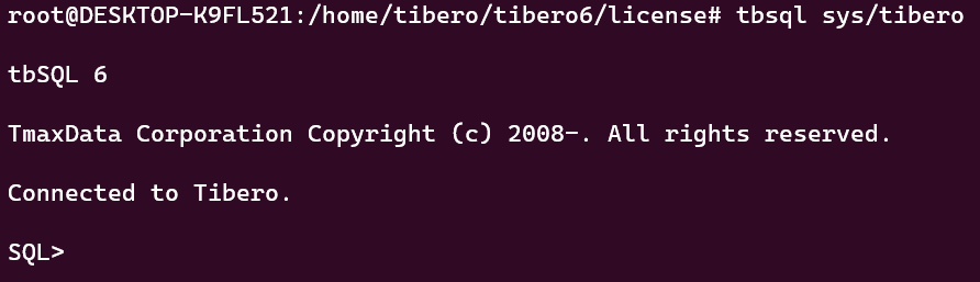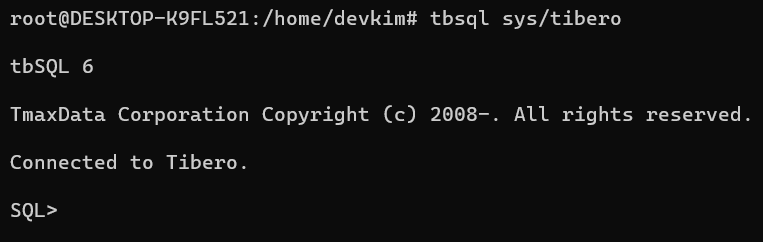 tbsql sys/tibero를 입력하면 아래와 같이 tibero에 접속하여 sql query문을 입력할 수 있게 된다.