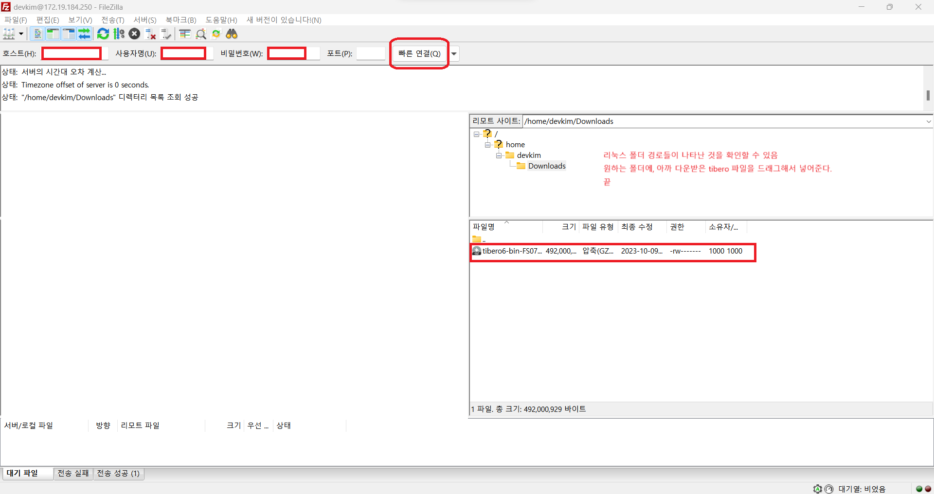 tibero6-bin-FS07_CS_2005-linux64-186930-opt-tested.tar.gz가 다운로드 완료가 되었다면, FileZilla를 켜서 Linux 서버와 연결해준다.