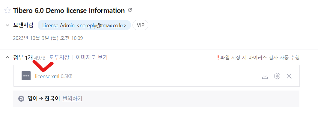 이후 본인 tmax 계정의 이메일로부터 온 라이센스 (license.xml)을 다운