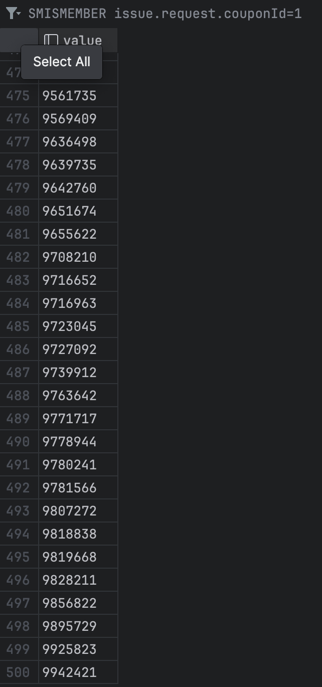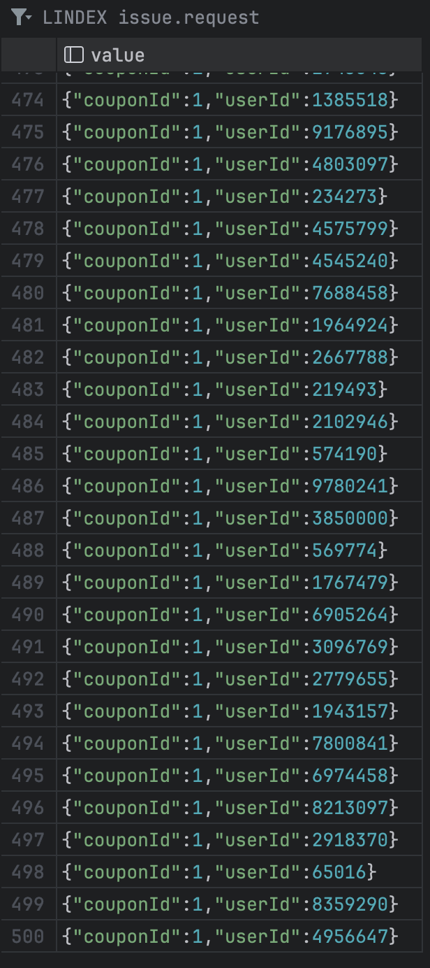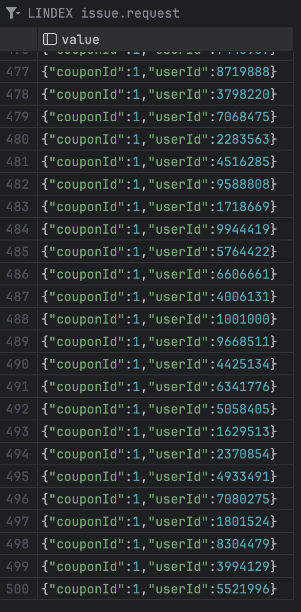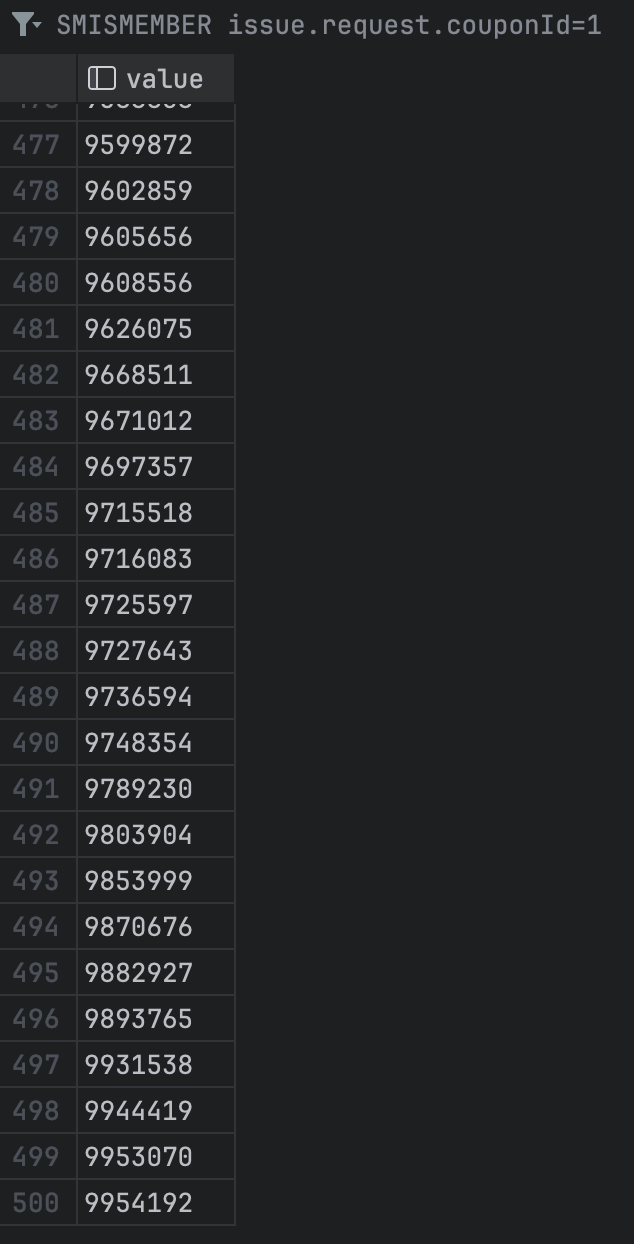 아래와 같이 레디스에서 500개 만큼 발급 요청을 잘 수행하는 것을 확인할 수 있었습니다.