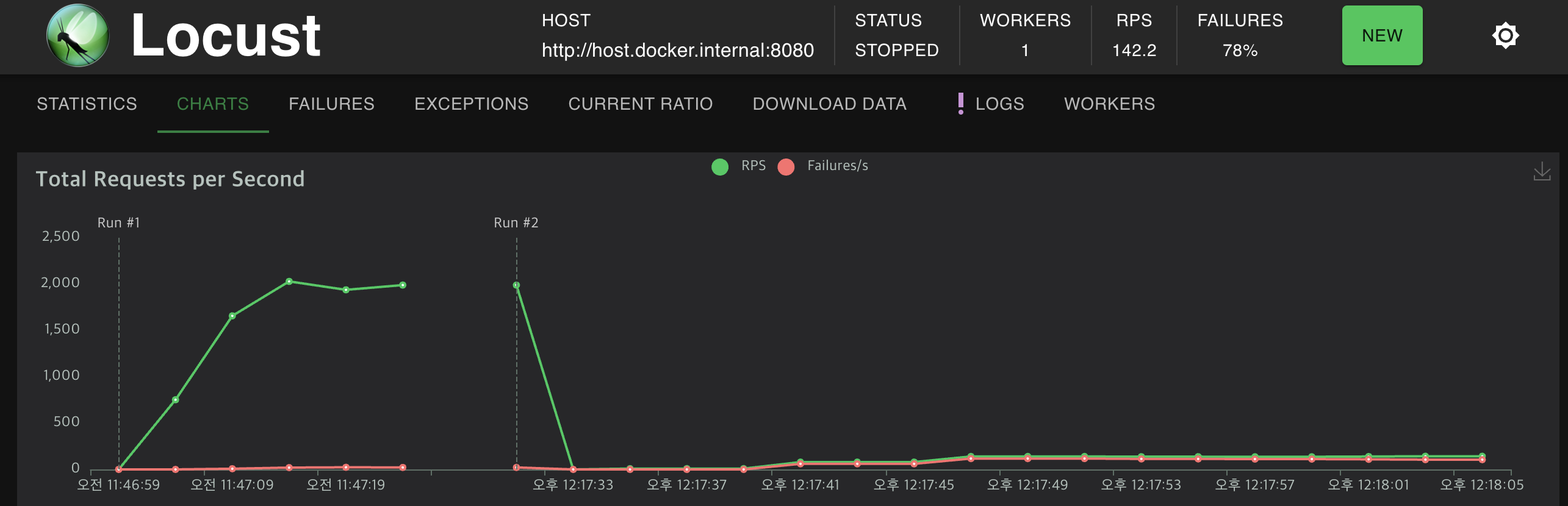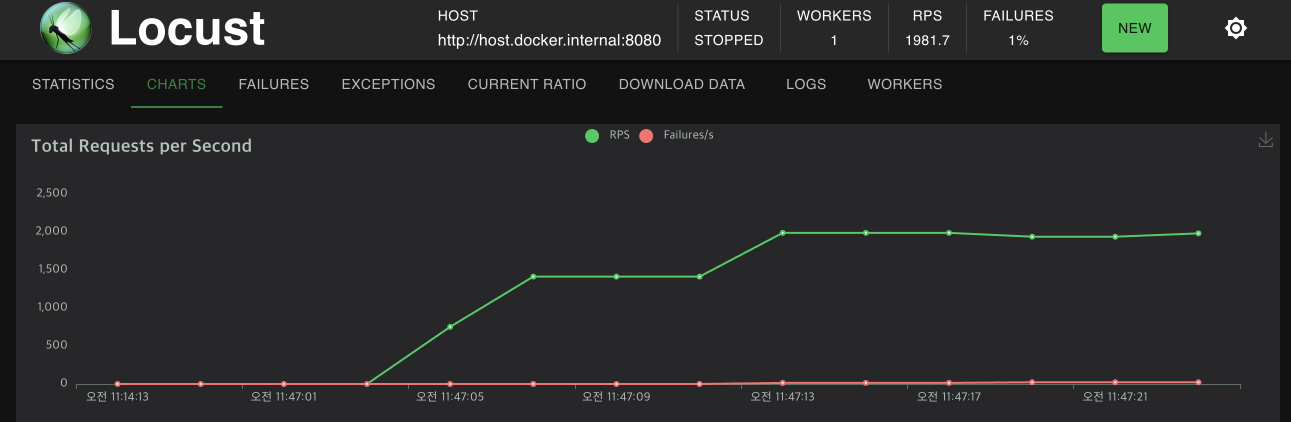locust를 통해 부하테스트를 시행하니 rps가 낮게 나오는 것을 확인할 수 있었습니다.