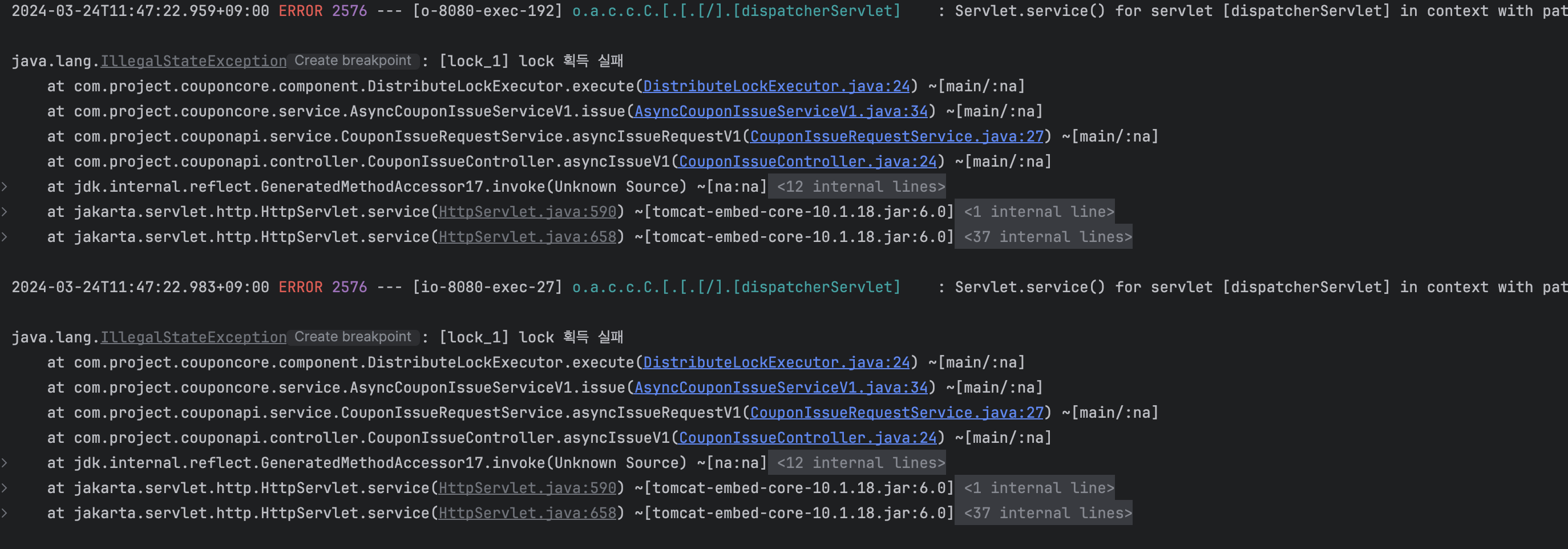 왼쪽, 오른쪽 스펙에서 모두 lock을 획득하는데 실패했다는 exception이 발생하는 것을 확인할 수 있었습니다.