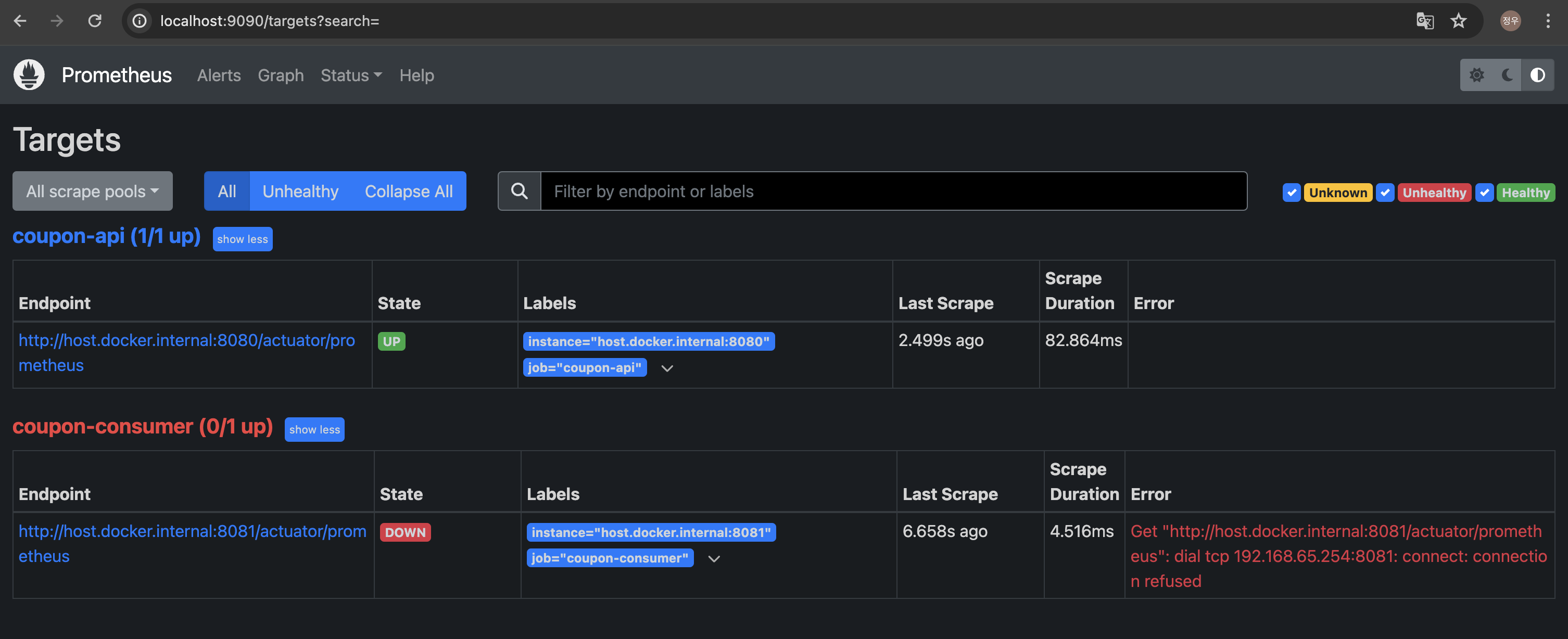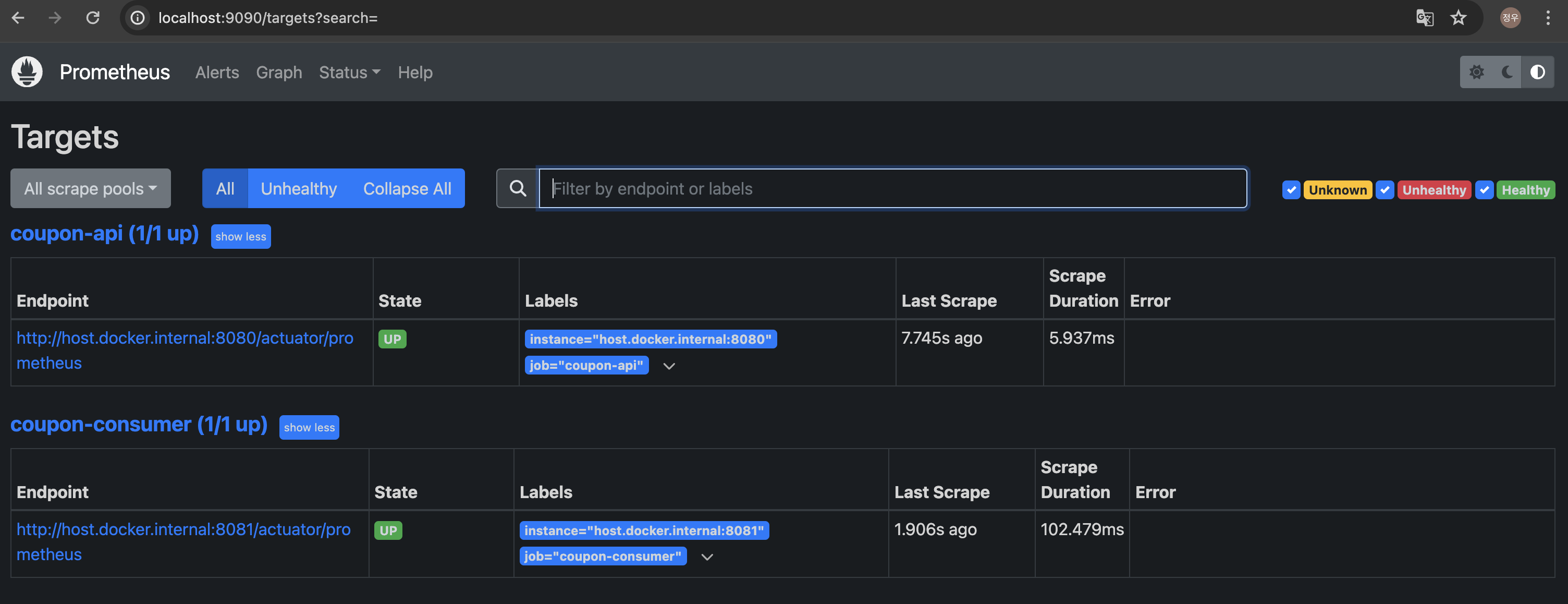 prometheus.yml 파일은 프로메테우스가 coupon-api와 coupon-consumer라는 두 개의 작업을 수행하며,