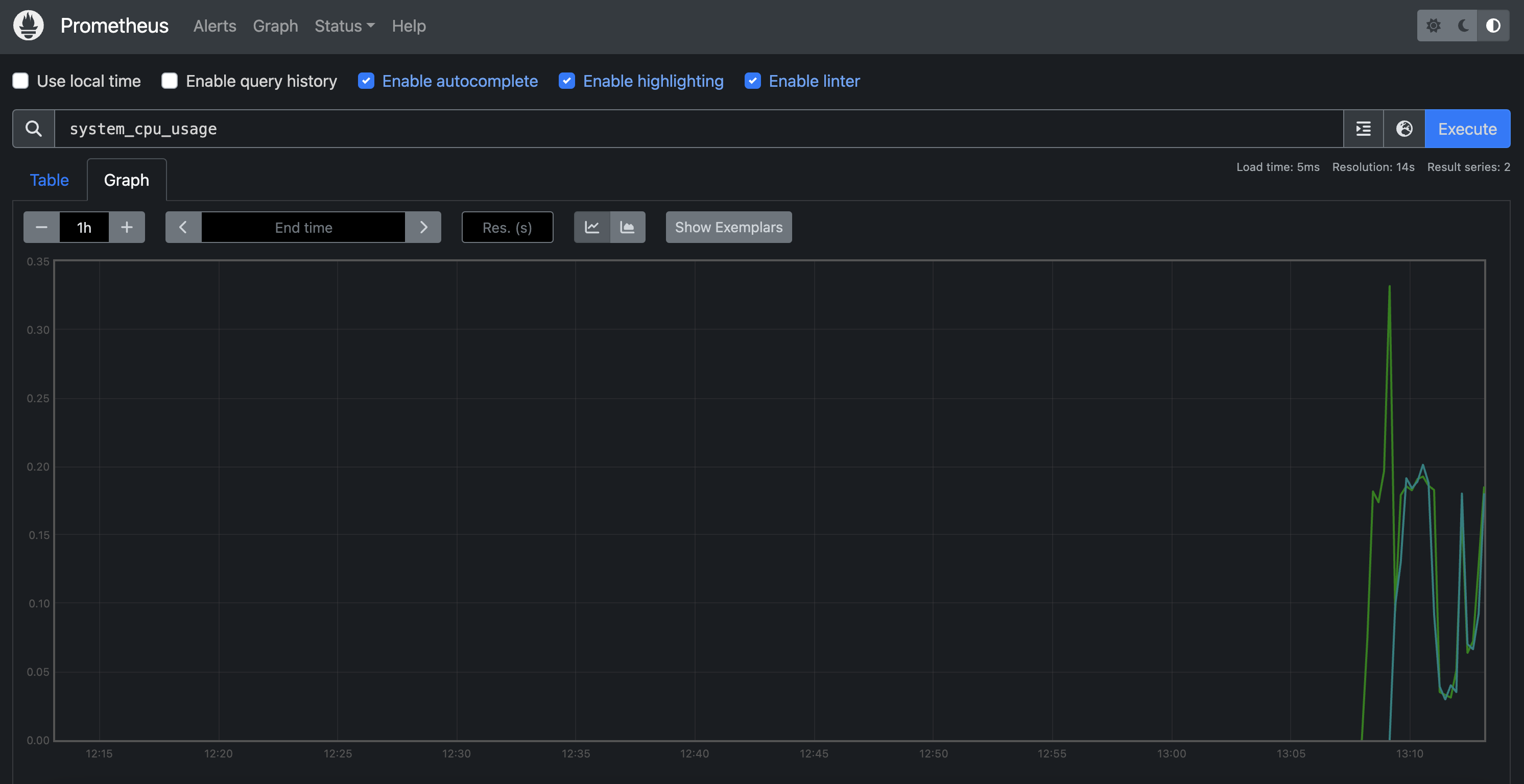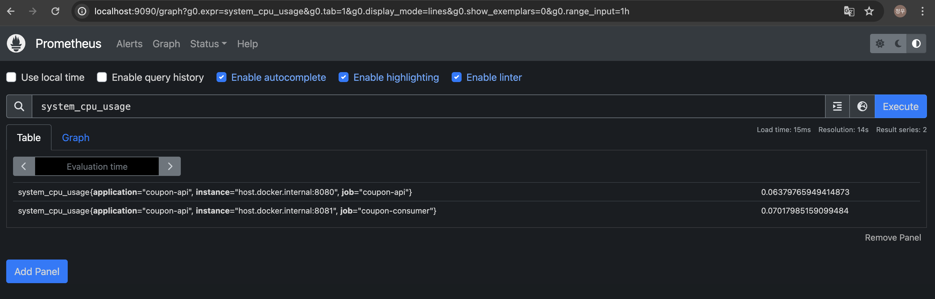 아래 사진처럼 system_cpu_usage를 검색하여 cpu 사용량을 확인할 수 있습니다.