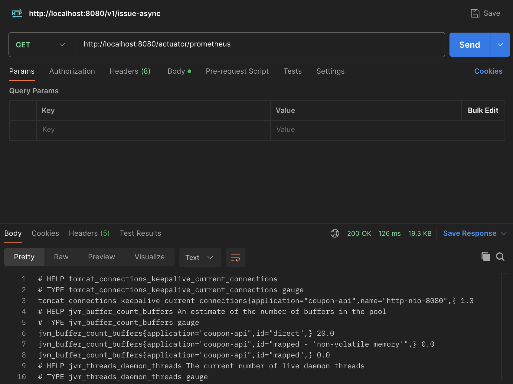 postman 등으로 엔드포인트인 http://localhost:8080/actuator/prometheus(저의 경우 8081도 포함)로 접속하면