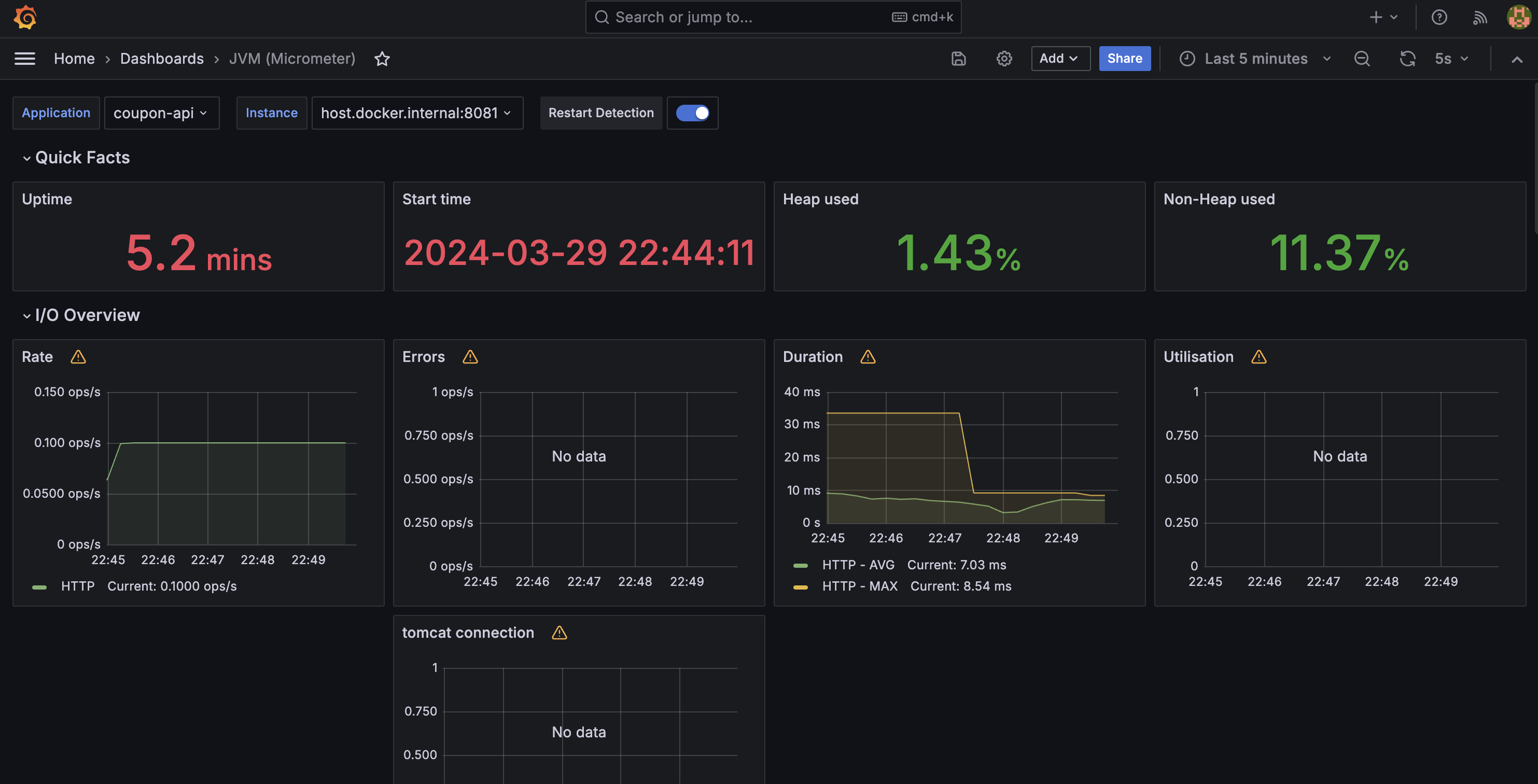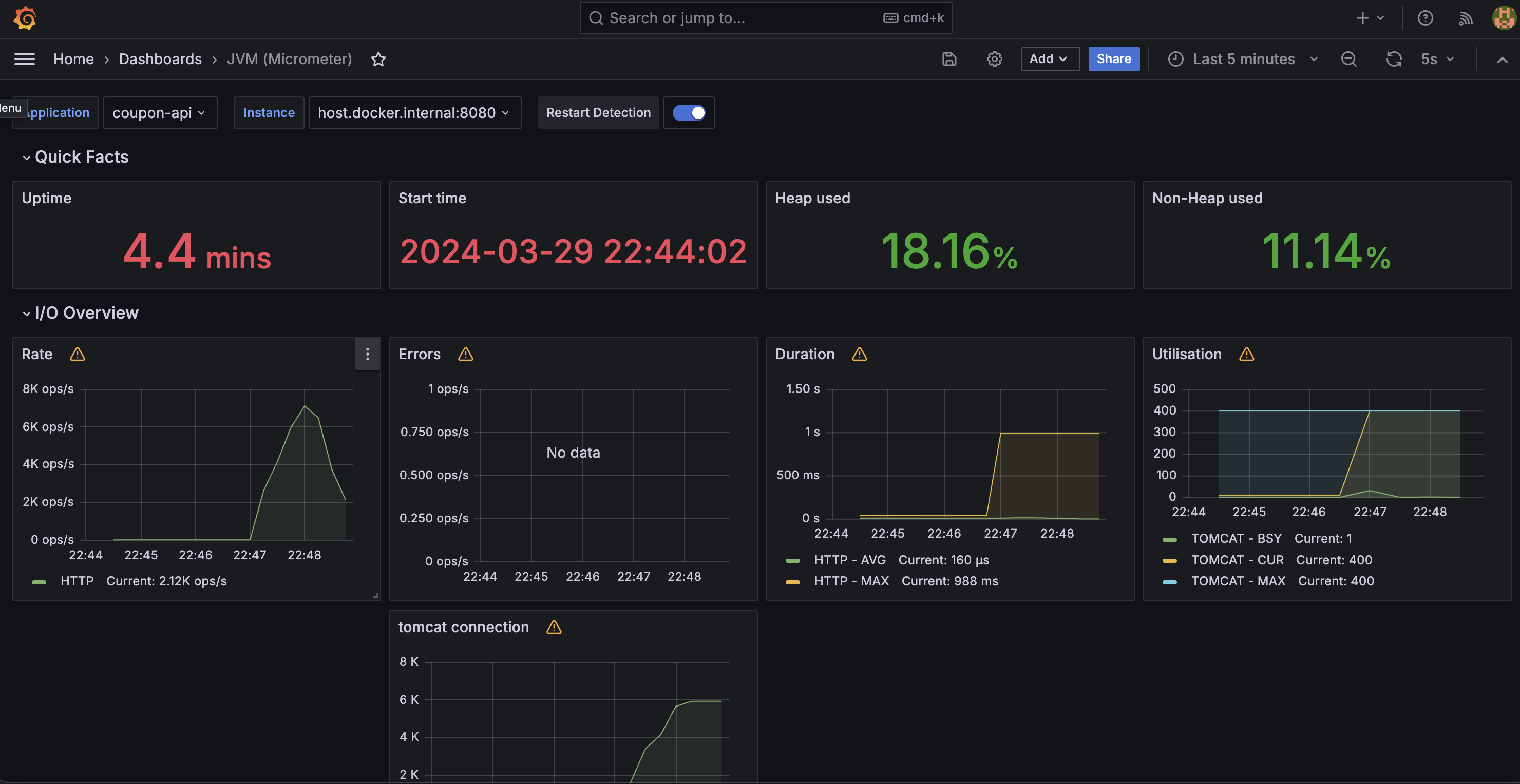 tomcat_connections_current_connections 메트릭을 수집한 내용들을 시각화 하는 대시보드입니다.