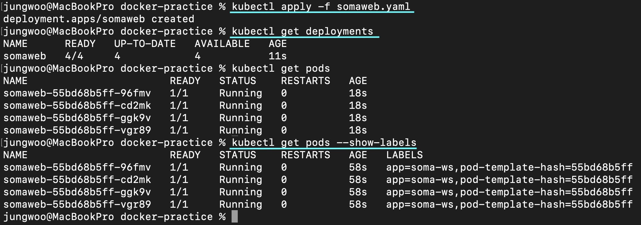 somaweb라는 이름의 deployment를 아래 조건으로 생성합니다.