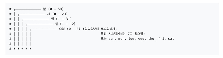 - 분, 시간, 일, 월, 요일 등을 기반으로 작업을 실행하는 계획인 cron 표현식을 사용하여