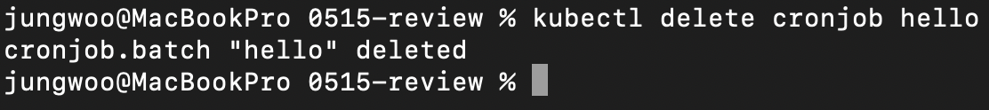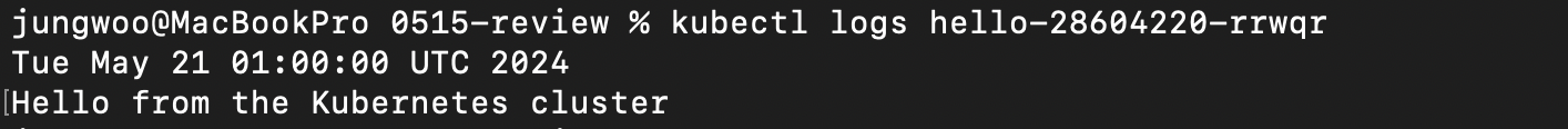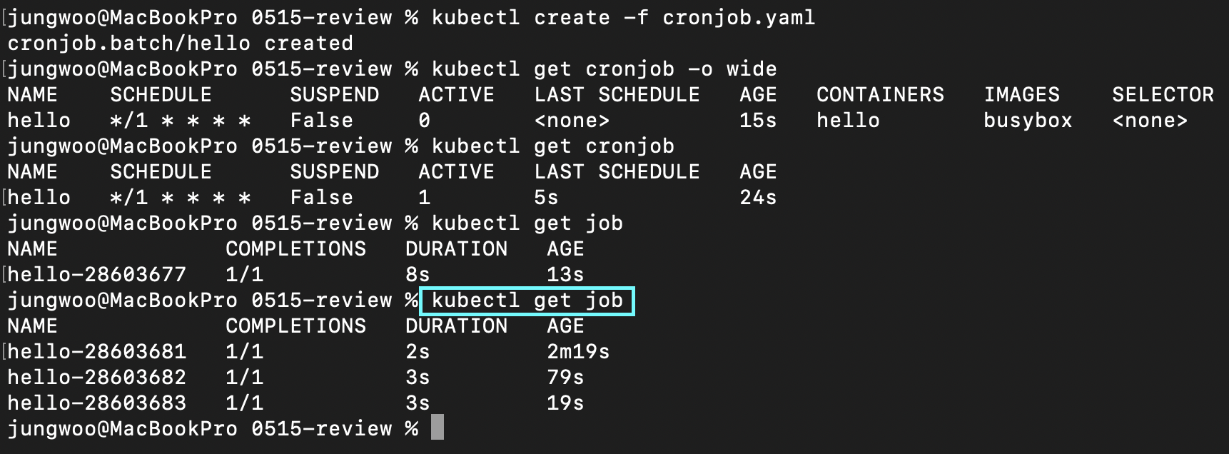 해당 파일을 kubectl create -f cronjob.yaml 명령어를 이용하여 크론잡을 생성할 수 있습니다.