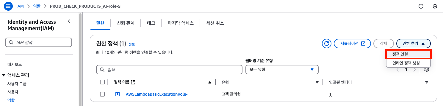 저는 정책 연결을 통해 "AWSLambdaVPCAccessExecutionRole"을 추가하였습니다.