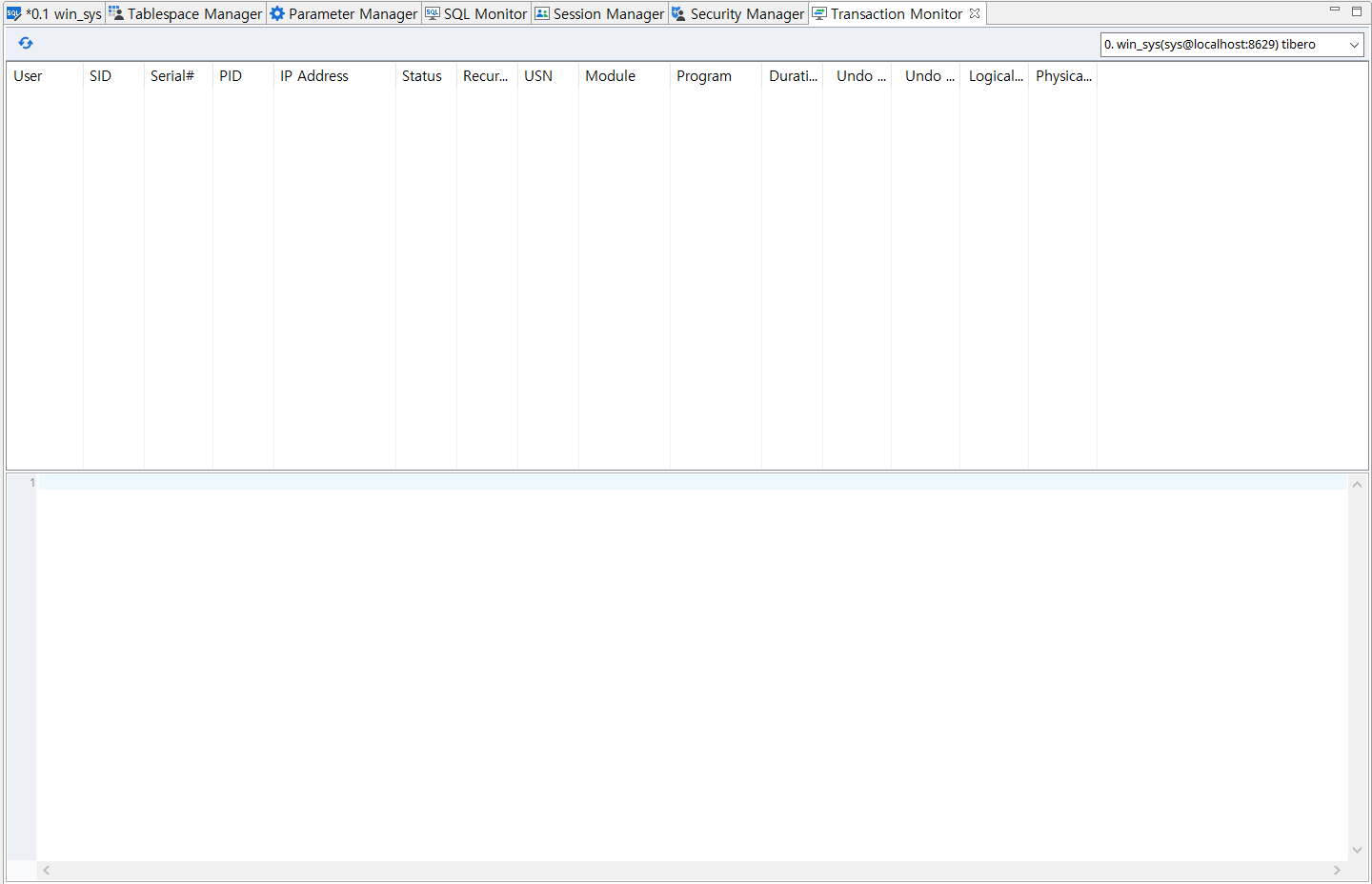 Transaction Monitor 화면에서 Tibero 서버의 트랜잭션을 모니터링할 수 있다.
