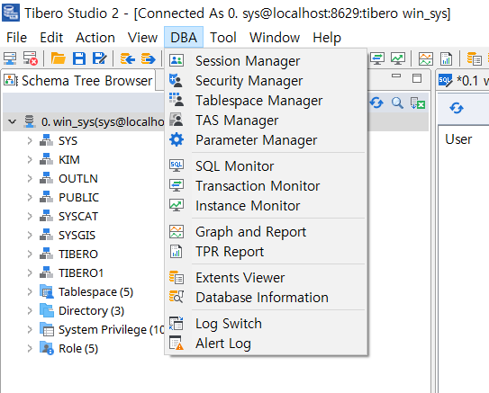 DBA > Session Manager로 접속하면 현재 tibero db에 로그인한 사용자들을 확인할 수 있다.