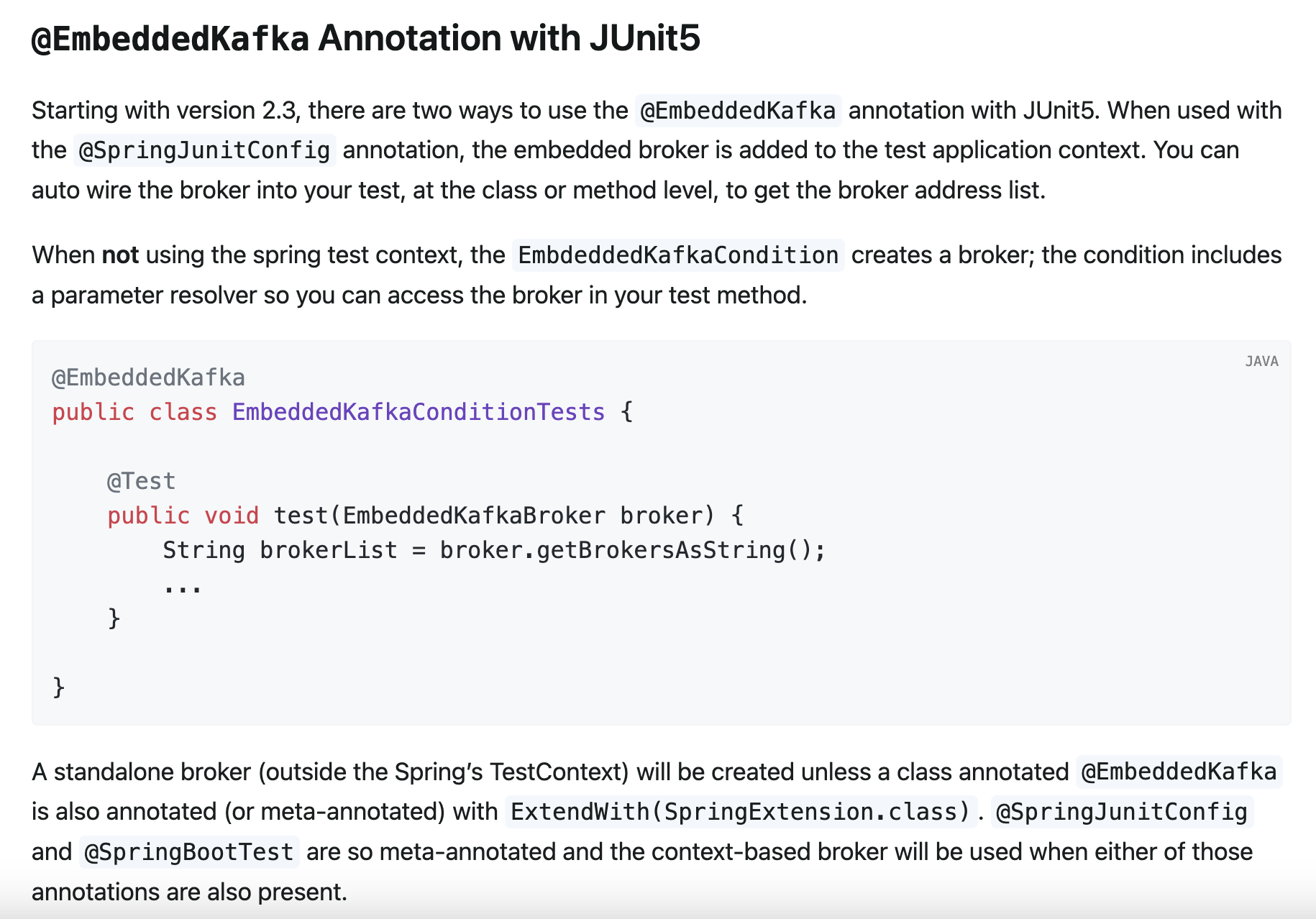 아래 공식 문서의 내용과 같이 JUnit5에서 @EmbeddedKafka를 사용하는 방법으로 테스트 코드를 작성하고자 합니다.