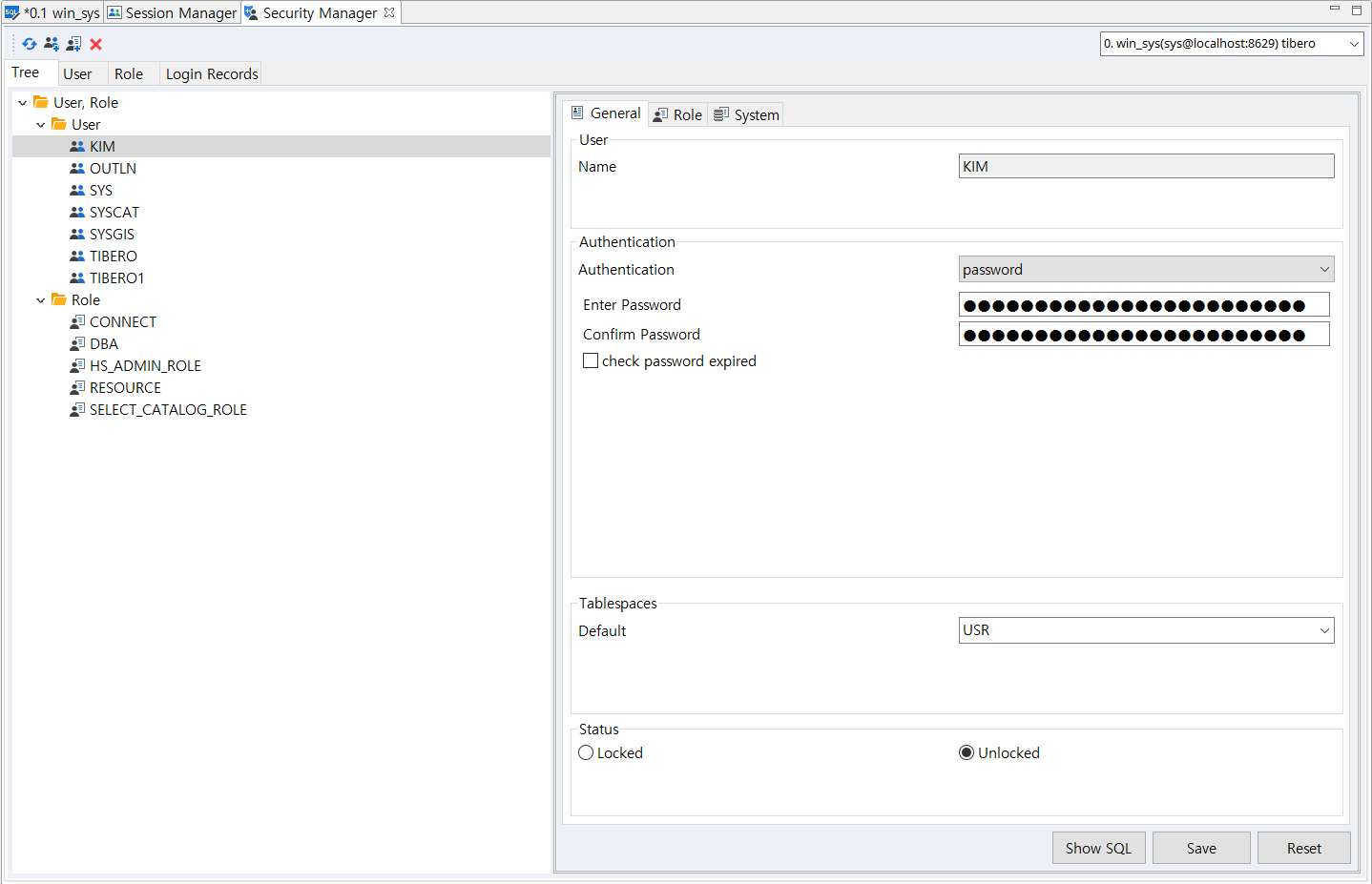 그 아래에 Granted Roles가 말 그대로 TIBERO가 가지고 있는 권한을 의미한다.