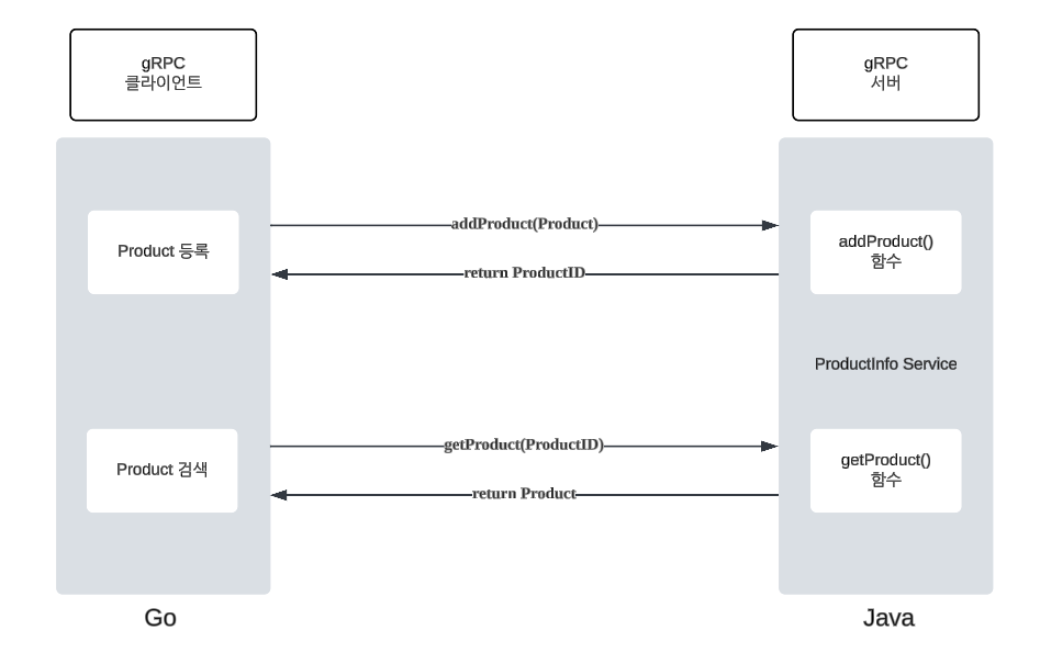 서버는 addProduct(product)와 getProduct(productId)라는 두 개의 원격 메서드를 제공하는 gRPC 서비스를 호스팅하고, 클라이언트는 이러한 원격 메서드들을 호출할 수 있습니다.