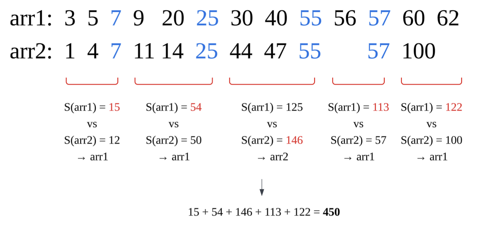 그리고 마지막에 대한 누적합을 구하기 위해서, 두 수열의 교차점에 해당하는 각 인덱스를 담는 idxList의 가장 마지막에 각 두 수열의 마지막 인덱스 쌍을 넣어줌으로써 해결할 수 있다.