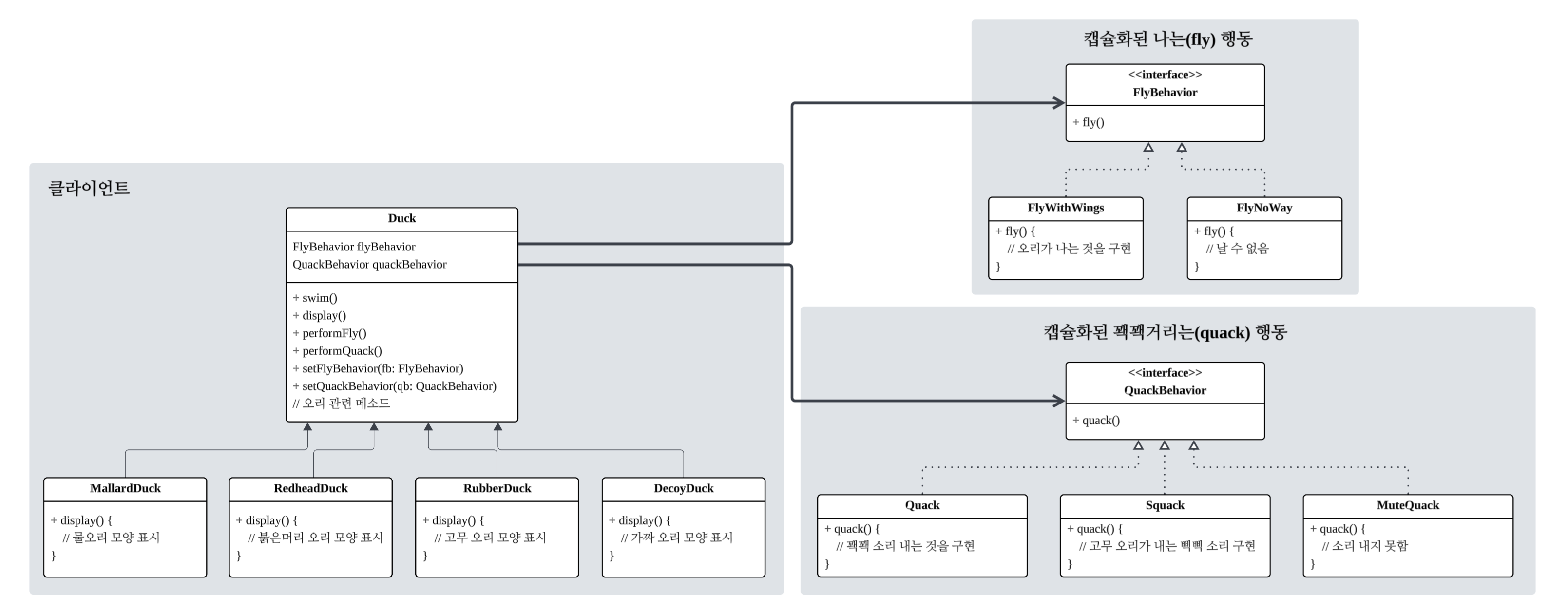 | 행동을 캡슐화하여 변경에 유연함 | 알고리즘(행동)을 객체로 분리했기 때문에, 런타임에 전략을 바꿀 수 있음 (ex. setBehavior()) |